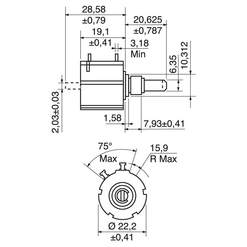 POTENZA:2W a 70°C TOLLERANZA:5% RES.ISOLAM.:1000 MOhm LINEARITÀ:0,25% TEMP.LAVORO:-55°C÷+125°C DIAM.PERNO:6,35mm
